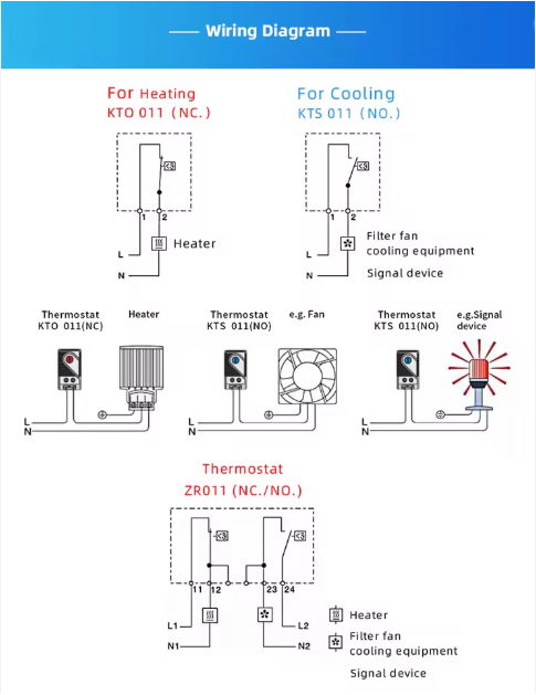 Thermostat (NO); contact maker for regulating of filter fans and heat exchangers or for switching signal devises ,